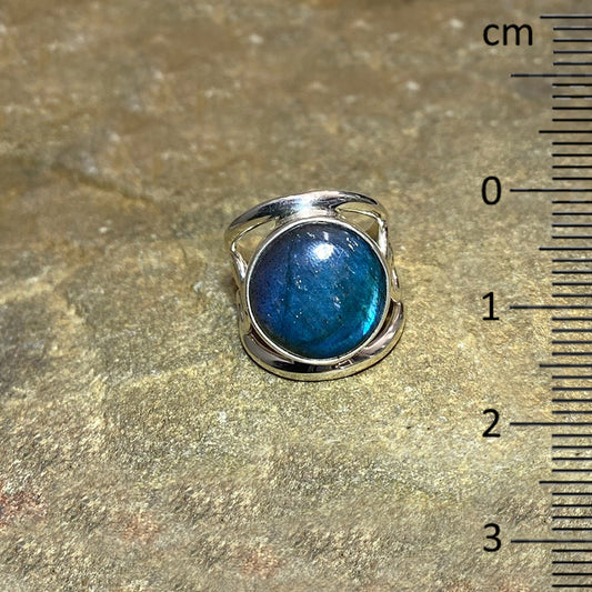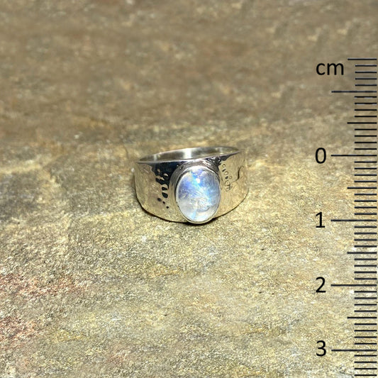 Round Rainbow Moonstone Swirling Sterling Silver Ring- Size 7.5