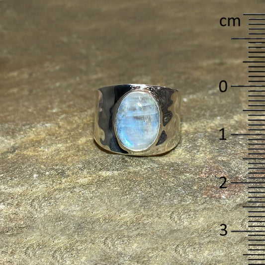 Oval Rainbow Moonstone Hammered Sterling Silver Band Ring- Size 10