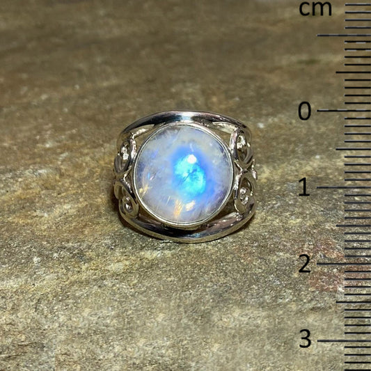 Round Rainbow Moonstone Swirling Sterling Silver Ring- Size 9