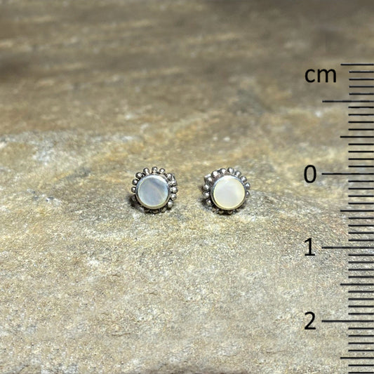 Round Mother Of Pearl Ornate Sterling Silver Stud Earrings