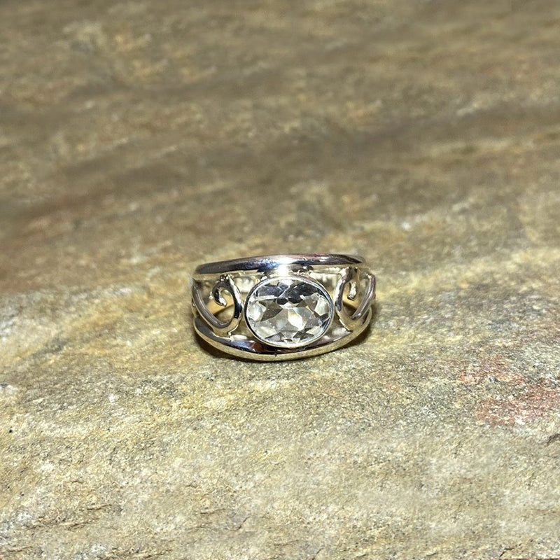 Swirling Sterling Silver Faceted Oval Clear Quartz Ring- Size 9
